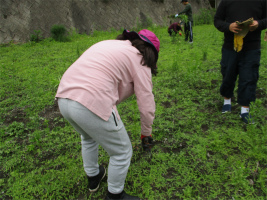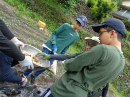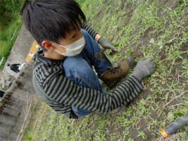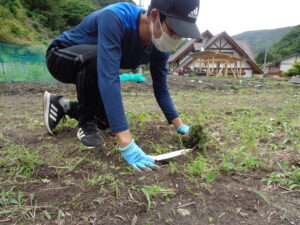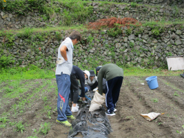 1日目の今日はチロル学園で昼食をいただいた後、現地の方の畑で草むしりとショウガを植える作業を行いました。草むしりでは、深くまで根付いている草や太い草も、スコップなどを使い友達と協力しながら工夫して取っていました。ショウガ植えでは現地の方の説明をよく聞き、指示通り且つ丁寧に作業に取り組めていました。初めてとは言え、「さすが3年生」!それぞれが集中して農作業に取り組むことが出来ました。