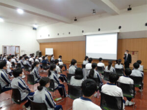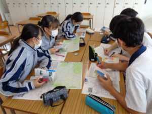 3年生は9月に2泊3日で京都奈良修学学習に行く予定です。2日目はAB組の混合班で、京都市内の見学地をタクシーで回ります。その事前学習としてHRの時間を使い、全体で注意事項を聞いた後、各班で一日のスケジュールを作成しました。どの班も活発に話し合い、期待感と高揚感に溢れた様子でした。寺社の見どころなど班員で話し合うことで、当日のイメージを持ちながら納得のいく行程が完成したようです。
