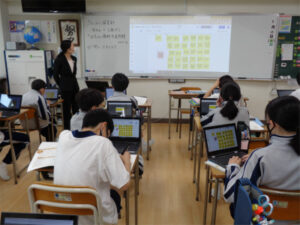 1年生探究科では、5つのゼミに分かれて探究の方法を学んでいきます。今回紹介するゼミのテーマは『信号のない横断歩道問題2022』。授業では、この問題について、各自が立てた「問い」をJamboardで共有して確認しました。生徒たちからは「道路交通法を知らない人はどのくらいの割合でいるのか」「この問題のために今、どういう取り組みが行われているのか」「県ごと、国ごとにどれだけ停止率の差があるのか」「停車率を上げるには?」など様々な「問い」があげられました。信号のない横断歩道の手前には♢マークがあることや、学校の前の道路にもこのマークがあることなど、新しい知識も得られ、生徒たちの関心も高まっていました。次回はフィールドワークに向けた準備を行う予定です。