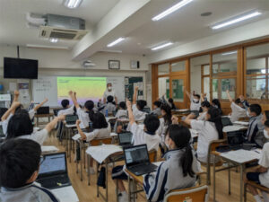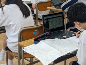 社会科では、清里周辺の様子の地形図を使って清里山荘合宿の事前学習を行いました。地形図に示された地図記号を調べたあと、清里山荘から美しの森へ向かう道路が上り坂か、下り坂か、平坦な道かを考えます。生徒たちは、地形図上に記された標高を表す数字や等高線をもとに、上り坂という答えを導き出すことができました。また、美しの森までのおよその距離を求め、到着までにかかる時間を確認しました。いよいよ来週にせまった山荘合宿。学びの要素も加えて、友達との楽しい時間を過ごしていきましょう。
