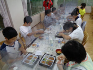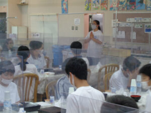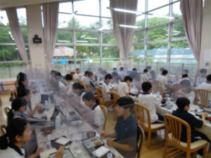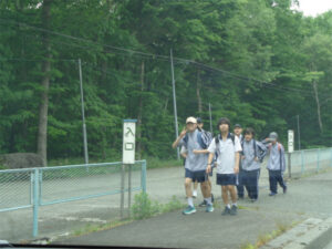清里山荘合宿二日目は、AB組はオリエンテーリング、CDE組はハイキングを中心に行いました。AB組は班ごとになり、地図を片手にチェックポイントで出題された問題の答えを相談しながらまわります。CDE組は3クラス合同で美しの森の展望台まで登ったり、清泉寮でお弁当を食べたりしました。途中、疲れから遅れだす生徒に「がんばれ!」と言って励ます様子も見られました。天候にも恵まれ、「疲れた~」と言いつつも、皆笑顔で山荘に戻ってきました。
