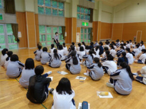 「校長のお話を聞き、清里山荘に行く意義、友達と関わっていく上で大切な集団行動、自主自立の精神の大切さ、努力(勉強や部活)の価値観などを学びました。」