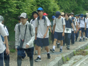 清里山荘合宿二日目は、AB組はオリエンテーリング、CDE組はハイキングを中心に行いました。AB組は班ごとになり、地図を片手にチェックポイントで出題された問題の答えを相談しながらまわります。CDE組は3クラス合同で美しの森の展望台まで登ったり、清泉寮でお弁当を食べたりしました。途中、疲れから遅れだす生徒に「がんばれ!」と言って励ます様子も見られました。天候にも恵まれ、「疲れた~」と言いつつも、皆笑顔で山荘に戻ってきました。