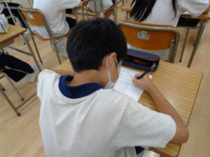1年生AB組の生命科は友愛をテーマとして進めています。前回は自分の「当たり前」と人の「当たり前」が違うということに気付きました。そして今回は友人関係の中でありがちな「いじり」について、映像を観ながら自分の考えをまとめていきます。入学から3か月近くが経ち、校外での宿泊学習も経験し仲の深まったからこその「いじり」が少なからずあるように感じます。だからこそ今、この質問を一人ひとり考える時間をとりました。