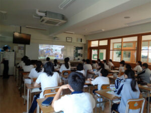 映像では何気ないいじりからエスカレートした「いじめ」を苦に命を絶った中学生の映像とともにこの問いかけがされました。映像の中でも同じ中学生の意見交換の場面があり、生徒たちは「自分の当たり前」ではない意見にも耳を傾け、自身の行動や今までの体験を振り返ったうえで、人との関わりで気遣っていくべきことをまとめました。