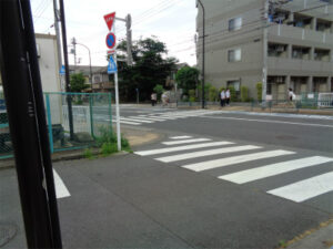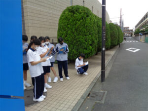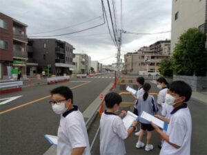 現在1年生はゼミに分かれて探究の基礎を身につけています。社会科関連のゼミでは、「信号のない横断歩道問題」について探究をしています。今回は、「信号のない横断歩道に横断者がいたとき、車はどのくらいの割合で停まるのか」という「問い」を検証するために、フィールドワークを行いました。サンプル数は少なかったものの、自分たちの予想を大幅に超える停車率の高さに、実地調査の有効性にも気づけました。次回は、調査結果の分析と夏休みに行う活動について話し合います。