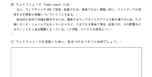 2年生の生命科では、「ニュース・リテラシー」について学んでいます。今回のテーマは「フェイクニュース」。情報を受け取る際、その真偽を見極める必要のあることはすでに学習しましたが、実際にフェイクニュースをどうやって見抜くのか、その方法を学びました。発信者が発言に責任をもっているか、文の表現が曖昧でないかなど、いくつかのポイントを動画で視聴した後、改めて自分たちでもできる対策を書きました。生徒のワークシートを読むと、これまでの授業で情報との付き合い方、向き合い方が身についてきていると感じます。