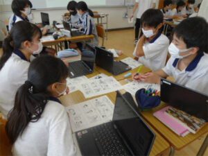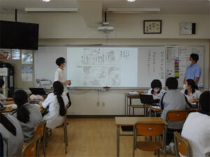 本校では、通常の授業の他に教科横断型授業(コラボ授業)を取り入れ、幅広い視野での学びをすすめています。今回2年生では、国語と英語のコラボ授業を行いました。まず、原作が英語で日本語にも翻訳されている作品から、セリフや作品タイトルにどんな違いがあるかを考え、その後反対に、日本語が原作の作品を見て、同様の活動を行いました。次にグループにわかれ、英語版の日本のマンガを読み、セリフを日本語にしていきます。「直訳だと何かおかしい」「意味はわかるが、この表現のほうが場面に合っている」といった話合いが活発に行われました。言語の自由さ・豊かさに触れながら、今学期の学びを振り返る時間になったと思います。