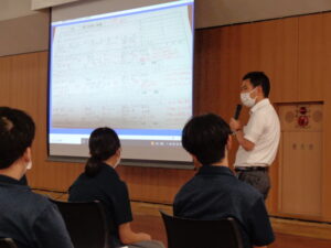 3年生の夏期講習の3日目となる今日は、講習の合間に生徒全員を集めて高校見学のポイントおよび高校紹介をしました。いろいろな高校を知ると同時に、これから進路選択を固めていく際に留意するポイントを押さえることを目的に行い、様々な視点からの学校の紹介をしました。また、卒業生のプランノートを見て、参考になるところの解説を行いました。