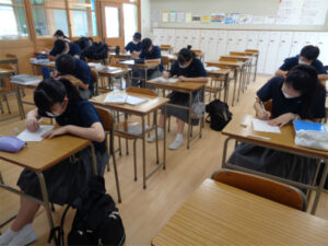 全17日の夏期講習のうち10日が終了しました。講習のグループでは皆で難問にチャレンジしたり、苦手を認め合ったりと、結束した雰囲気があり、互いに高め合う様子が見られます。課題は毎日3時間分。それに加えて自分の苦手分野を補う自主学習。プランノートに毎日のトータル学習時間を記入し学習量を意識する中で、実力と自信を高めています。この習慣を崩さずに、休み中も根気強く学習に励み、後半の講習に臨めると良いです。
