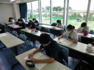 今日から2年生の夏期講習が始まりました。国語・数学・英語の単元別問題演習や発展問題への取り組みを通して、既習範囲の補強と応用力の育成を目指します。講習は習熟度別に5つのグループに分かれ少人数で行っており、普段の授業とは違う環境の中で刺激を受けながら、意欲的に取り組む様子が見られました。