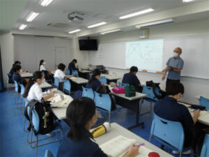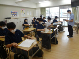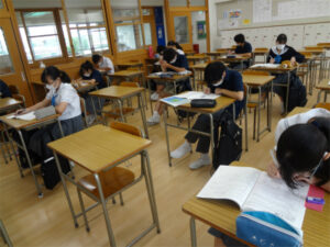 2年生の夏期講習では、5日間、既習事項の復習や応用問題に取り組みました。少人数の講習は学期中の課題やつまずきを解決しやすく、理解もより進んだようです。3年生で行われる特別進学学習と同じスタイルで行うことにより、来年の今頃を想像し、意識も高まったと思います。講習で得た経験を土台に、今後の学習に全力投球してほしいです。