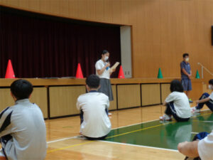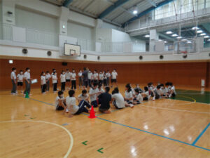 始業式後、3年生は体育館にて合同体育を行いました。赤・緑・白の3チームに分かれ、学年競技「大繩跳び」「障害物競争」の練習です。ペア、走順、役割をスポーツ推進委員が中心となり、3年生らしく自分たちで率先して決める様子がありました。実際に走ったり、跳んだりすることで競技のイメージもついたようです。2学期初日に体を動かし、夏休みを経て体力が落ちていることを感じた生徒もいたようですが、ペア、チーム、学年全体で声を掛け合いながら練習を重ね、最高学年としてスポーツ大会を盛り上げてほしいです。