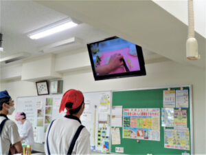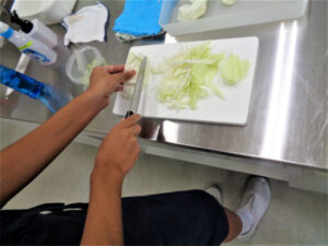 「包丁の使い方」が今日の実習のテーマです。まず先生の説明がありますが、先生の手元が映し出されますので生徒は真剣に視聴していました。次はいよいよ自分で野菜を切ります。グループの先生のアドバイスを聞きながら、片付けまで全員が一生懸命取り組んでいました。