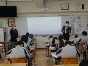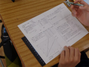 今回は1年生の数学と理科のコラボとして、理科で学習した「物質の密度」について数学的に考える授業を行いました。