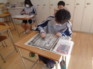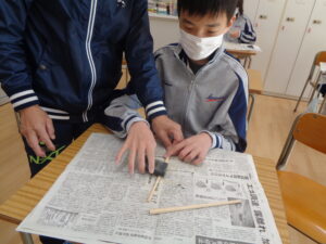 実習は、「調理」「木工」「被服」の3分野で作業能力を向上させていく授業です。今日は木工で、木箸の製作を行いました。細い木の角を目の粗い紙やすりで削っていきます。まず木の頭と先端の面の中心に印をつけ、周りをバランスよく削れているか確認できるようにしました。削っていくうちに角が丸みを帯びてくるのがよくわかりました。単純な作業ですが一定時間継続することが大切であり、今後社会に出て仕事をする時につながっていくことを伝えています。