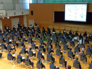 毎年2・3年生AB組を対象に、生命科の職業観育成に関連して、「金融・経済にする講演会」を実施しています。今年度は日本証券業協会からインストラクターをお招きし、「株式会社制度と証券市場のしくみ」をテーマにお話しいただきました。内容は、将来なりたい職業を糸口に、金融のしくみや投資の基本、金融業界で働くことのやりがいまで多岐にわたりました。質問や発言も活発になされ、金融について初めて学ぶ2年生には身近に感じられ、公民の授業で学んでいる3年生にはより理解が進む講演でした。