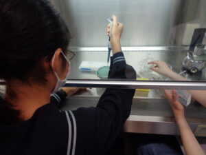 希望者対象の科学講座「サイエンスラボ」の企画として『植物の病原菌観察教室』を、法政大学の生命科学部応用植物科学科の実験室にて開催しました。担当の先生より植物の病原菌の研究が食糧問題でどのように生かされているか、また今後の問題点などの講義があり、その後学内の施設を見学しました。多種類の植物や菌が培養されている装置などの説明を受け、メダケ(イネ科)とクヌギの病原菌を光学顕微鏡と電子顕微鏡で観察しました。葉から病原菌を採取しプレパラートを作る作業は生徒たちも真剣です。菌を培養する作業では、シソやレモンなどの身近な物から抽出した液をかけてどの程度菌の増殖が抑えられるかという作業も行い、後日担当の先生が結果を画像で送っていただくことになりました。植物の病気を抑えられるという発見につながるかもしれません。生徒たちが普段体験できない貴重な実験観察ができ、大変有意義な時間になりました。