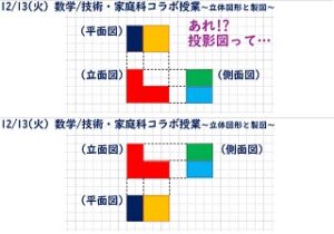 また、投影図においては数学と技術科では平面図(平画面)と立面図(立画面)のかかれる位置が逆になっていること、そしてそれはなぜか、というところも教科の特性や目的と合わせて考えることで、それぞれの理解につながります。