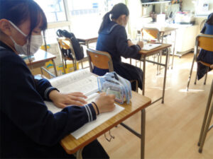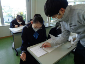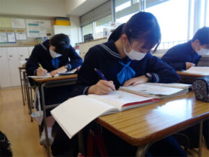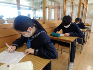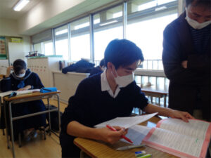 来月から入試本番が始まる3年生が、冬休みに入り学校で個別学習を行っています。分からないところを先生に質問したり、友達から刺激をもらったりしながらプランを実行する期間として、多くの生徒が取り組んでいます。各教室に分かれた少人数のグループ(特別進学学習のグループ)を覗いてみると、その集中度合いは非常に高く、各自が直前のモードに切りかわっていることが伝わってきました。この状態をしっかり維持しつつ体調管理を万全にして、2023年に向かいます。