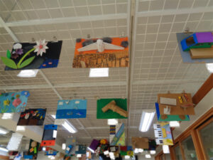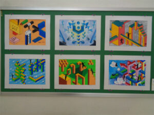 学期がもうすぐ始まりますが、校内には美術の絵画作品がたくさん掲示されています。1年生の「色面構成」は直線と曲線を組み合わせて立体を描くデザインに各自の思いを乗せた表現で、秀逸なアイデアに引き込まれます。美術室は2年生の「表現を形に」が天井近くに掲示され、素敵な空間になっています。お互いの作品を見て学ぶことによって美術を愛する心が育ちます。