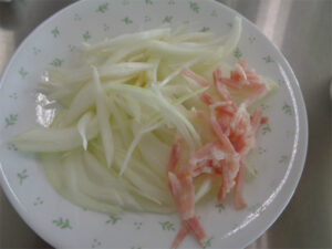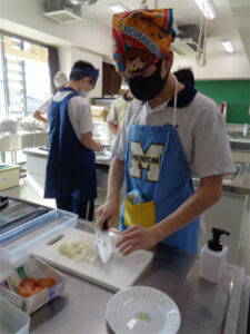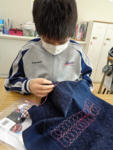 実習の時間は、クラスごとに調理と被服に取り組んでいます。調理では、今回は「玉ねぎの細切り」を課題として、包丁技術の確認を行いました。学校で習った料理を家庭で繰り返し作っている生徒も多く、道具の扱いや洗い物の手際が上達しています。今日作った「オニオンスープ」も、ぜひ家庭で再現してください。被服のクラスは、「刺し子の巾着」の製作を進めています。糸通し、玉止め、玉結びなど裁縫の基本をマスターし、縫い目の幅を揃えて丁寧に縫うこと、作業の持続力を保つこと、そして、困った時や分からない時には落ち着いて相談することを授業の狙いとしています。被服も2年目となり、独力で縫い進められる生徒が増え、集中して作業に臨むことができています。