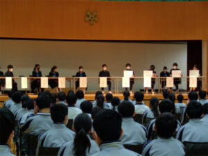 2月に行われる友愛会(生徒会)会長・副会長の選挙に向けて立候補期間が終了し、定数4名に対し、合わせて10名の立候補者が出ました。校内掲示板には選挙ポスターが掲示されており、広報活動が本格化しています。本日、昼の全校活動の時間には立候補者による意見交換会が行われました。司会は2年生の選挙管理委員が行います。1つめの質問は「武蔵野東中学校の理想像は?」です。パネルにそれぞれが強調したい文字を表し、意見を発表しました。2つめの質問は「学校生活を活性化させるために今自分が意識し、取り組んでいることは何か?」です。これについては挙手制で発表し、最後にそれぞれの主張についての意見交換、質疑応答を行いました。各立候補者の熱意ある訴えから、来年度の友愛会のリーダーを担う意気込みが感じられ、有権者も真剣に耳を傾けている様子でした