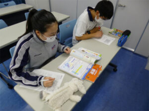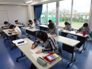 3学期も半ばとなり、今年度の学習のまとめの時期に入りました。本校では3年生の4月から放課後週3回、受験対策として「特別進学学習」(通称:特進)を行っています。特進は担当の先生の下、少人数の習熟度別グループごとに入試演習を行い、切磋琢磨しながら得点力を伸ばしていくものです。2年生AB組はその前段階として、5教科の基礎固めや学習の自立へのさらなる意識づけとして「プレ進学学習」をスタートしました。これまで探究科を行っていた水曜日の7時間目に、少人数の5グループに分かれてドリル形式で個別に演習に取り組み、得意・不得意分野の分析を行っています。集中して黙々と取り組む様子から、来年度への意気込みが伝わってきました。
