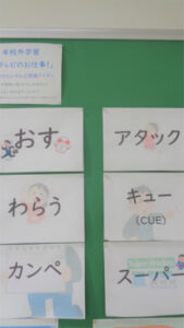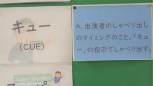 明日のテレビ局での番組制作体験に向けて1年生は気持ちが盛り上がってきました。学年掲示板にはテレビ業界独特の言い回しに関するクイズが貼ってあります。「キュー」「おす」「アッタク」などの意味を問うものです。このような用語を使いながらA~Eの混合班で作られる番組の出来はどうなるでしょうか?