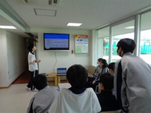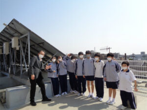 武蔵野東中学校の屋上には、ソーラーパネルが設置されています。SDGsプロジェクトでは、昼休みの時間を使いこの太陽光発電施設の見学と太陽光発電について知識を深めるツアーを企画しました。参加した生徒たちは、巨大なパネルを初めて見て驚くとともに、高い関心を示していました。続いてSDGsプロジェクト生徒から、太陽光発電のメカニズムやメリット・デメリットなどについての説明を聞き、知識の面でも多くのものが得られ、充実した時間となったようです。
