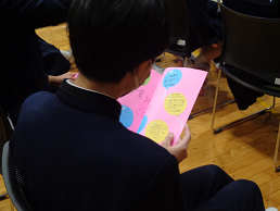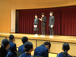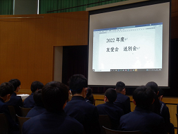 修了式後に友愛会主催の送別会が行われました。アクティベーション委員会が司会・進行を行い、学校にまつわるクイズを出題したり3年間の思い出を振り返るスライドショーを流したりして、縦割り活動での最後の思い出を作りました。その後、在校生は色紙を手渡して卒業生からの温かい言葉をもらい、互いの別れを惜しんでいたようです。在校生は3年生の大きさを再確認するとともに、「これからは自分たちが学校を引っ張っていく番だ」という思いを新たにすることができました。在校生と卒業生の心の通った素晴らしい会となりました。
