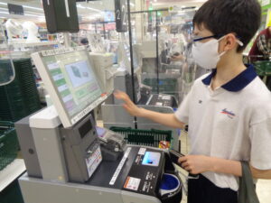 「体験・実習」は2時間続きの授業で、実生活に必要なスキルを経験を通して学んでいきます。昨日の体験は「スーパーマーケットでの買い物」でした。事前にクラスで買い物の一連の流れについて確認してからむかいました。入店から棚の表示を見て商品を選び、足元の印を見てレジに並ぶところまでは1年生のときよりスムーズにできています。セルフレジでの支払いでは「現金」や「カードを持っていません」という表示をタッチする必要があり、戸惑っていた様子が見られました。次回は支払いもスムーズにできるよう言葉の意味を再確認して臨みます。