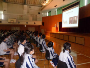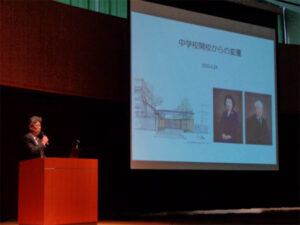 新年度の4月には、本校では全校生徒における「創立を学ぶ会」が行われます。創立者のことをはじめ、学園や中学校の開校時のことを学んでいきます。創立者のお人柄がわかるエピソードや、開校当時の生徒の学校生活の様子などスライドを見ながら説明を聞きました。創立者が生徒に願いを込めたメッセージと創立者の「書」や残された「ことば」などから、40年後となる今の生徒たちへと想いが伝わりました。生徒たちは創立の精神を学び、私学で学べることへの親への感謝と自分がどのように成長していくべきかを考える時間となりました。