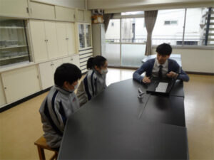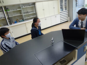 本校にはALT(英語指導補助)の教員が常駐しており、学校生活全般にわたって生徒と関わり、英語教育をサポートしています。その1つが放課後のConversation timeです。ALTのエリック先生と1:2で、好きなアニメや部活動など、身近なテーマで自由に話すことができます。エリック先生も、生徒の様子に合わせ会話をリードしてくれます。「最初は緊張していたが楽しかった」「盛り上がった。次が楽しみ」といった生徒の感想もあり、授業の枠を超えて英語力を磨く場となっています。本校を昨年卒業した生徒は中3修了時に約8割の生徒が英検準2級を取得していました。このような活動が英検の好結果につながっています。