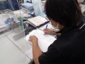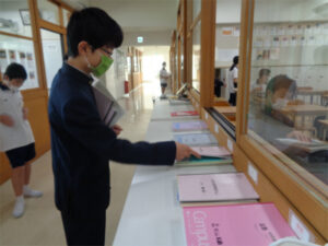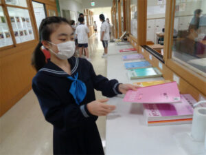 プランを立て、実行し、自己評価して次に活かす…これを習慣にすることで、生徒自身が自分で伸びる力を獲得していくのが本校の学習指導の一つの柱です。生徒たちは朝学校に来ると、「プランノート」とともに、前日家で学習した「自主学習ノート」を提出します。それを各教科の係の生徒が担当の先生のところに持っていき、コメントが入ったものが1日の最後に返却されます。画像は1年生が登校後、ノートを提出している様子と教科の先生がノートを見て、アドバイスを書いている様子です。