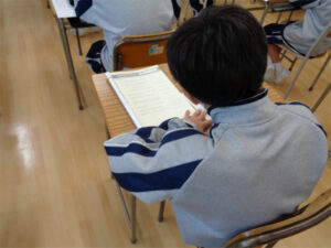 社会科では、1~3年生まで共通のテキストを使用する進級式の「歴史用語検定」(‟歴検”)を年間5回行っています。歴検は、合格して進級する場合、各級とも繰り返し最初から出題されることが特徴です。これを毎回続けることで歴史の基礎事項が確実に定着することを目的にしています。今年度第一回の歴検を行い、1年生は全員が最初の5級からスタート。順調にいくと3年生の7月で最高位に到達します。3年生は今回、現時点での最高位6段に学年の約50%の生徒が挑みました。これに合格すると次は最終の7段です。