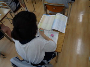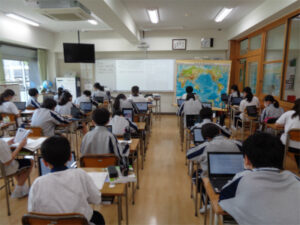 1年生の地理では、世界の国々についての学習が始まっています。授業では、自分が興味を持っている国について、基本情報や特色となる産業などについて調べました。地図帳やインターネットを活用して、統計資料も示しながらその国の良いところを調査。自分が好きな国を調べるとあって、生徒たちは主体的な姿勢で取り組んでいました。国調べの活動を通して、世界の国々に興味を持つとともに、統計資料の活用についても理解を深めていきます。