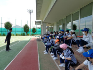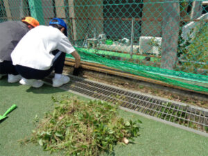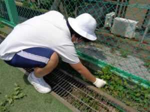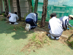 1、2年生が校外学習に行っているので普段より静かな校内です。3年CDE組は、6月に行われるチロル学園合宿に向けて、農作業の練習(除草)を行いました。まずは、身支度です。屋外に出て腕や脚に虫よけスプレーをかけ、帽子と手袋を着用します。その後、水筒を持って集合し、作業の説明を聞きます。今回は、クラスごとに場所を分け、任された場所の草抜きを20分間集中して行う、という設定です。作業姿勢を持続すること、時間いっぱい担当場所をきれいにするよう努めること、抜いた雑草は1か所に積み上げておくことなど、事前の留意事項を守って作業ができていました。短い時間でしたが、作業後にきれいになった校庭を見て、達成感のある表情をしていました。