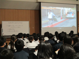 1~3学年AB組を対象にした自転車に関する交通安全教室を行いました。本校では毎年、自転車通学生に対し、ルールを守り安全に通学するために講習の場を設けています。今回は、DVDを視聴しながらワークシートを用いて注意すべき点などについて考えた後スライドによる説明を聞き、自転車利用時のルールを改めて確認できる場となりました。