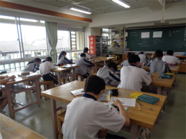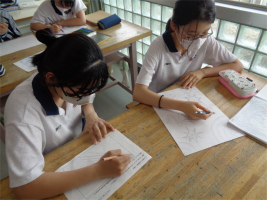 1年生AB組の美術では「音の世界」をテーマに、色面構成による平面作品を制作しています。部分的に写真や印刷物をコラージュ(切り貼り)する表現も取り入れて完成を目指します。今はアイデアスケッチをしながら、下絵を描いている段階ですが、それぞれが「海の音」や「鳥のさえずり」などイメージを膨らませ、様々なアイデアが生まれてきています。抽象形や透視図法を使った構成に挑戦しており、表現は写実的なものだけではなく、様々な伝え方があることを感じ取っているように思えます。今後は、アクリルガッシュ(絵の具)の使い方を身に付けながら、色相・明度・彩度、補色の関係など、学んできた色の仕組みも活用し、イメージを形にしていきます。