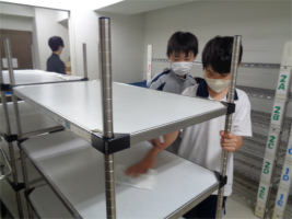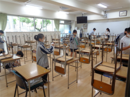 1年生の清掃班が新しくなりました。毎朝HR後の10分間清掃を行っています。新たな清掃場所、新たなグループで、清掃用具の使い方を確認し、チームで協力しながら取り組んでいます。今回の班は清里山荘合宿の活動班をもとにしたこともあり、コミュニケーションもよくとれ、スムーズに取り組むことができています。今後も学校生活や行事などでさらに関わりを広げ、友好を深めていってほしいと思います。