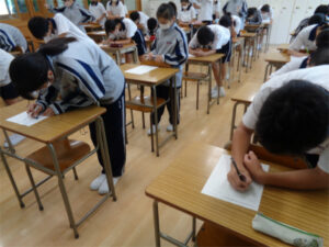 まずは自分の長所を書いた後に、自分の用紙を机に置き、全員が順番にクラスメイトの机を周り一人ひとりの良いところを記入していきました。最後に自分の用紙に書かれたクラスメイトから見た自分の良い所を見て、感じたことを書く時間を設けました。