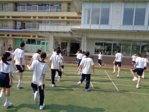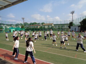 本校では生徒会を「友愛会」と称し、生徒全員が友愛会の専門委員会に属して活動しています。スポーツ大会はスポーツ推進委員が中心になって運営します。そのスポーツ推進委員が企画したトレーニングダンス、略してトレダンの第1回目が先日行われました。これは希望者が参加する活動で、朝から体を動かし体つくりをするものです。今月は足腰を鍛えることをテーマに生徒が動きを考えました。50名ほどの生徒が参加し、音楽に合わせて体を動かして、楽しんで行っていました。