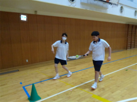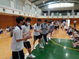 1学期も終わりが近づいてくる中で、クラスの枠を超えてその仲を深めていくことを目的として学年レクリエーションを行いました。2学期に行うスポーツ大会のチームを元に、①拍手リレー、②リングを狙って!フリスビー、③ラケットボール運びリレーの3競技を行いました。どの競技もクラスの枠を超えて協力し合って楽しむ姿に、今学期の成長と充実を感じました。