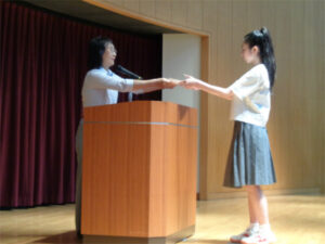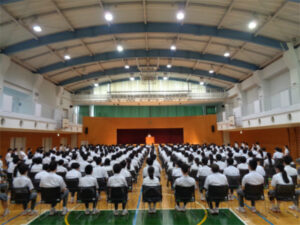 1学期の終業式が行われました。今年度は、球技大会や校外学習、合唱コンクールなどの行事が実施できたことで、生徒たちは充実感を得ることが出来ました。校長先生からは、学期のまとめとして、中学生として「言葉のもつ力」の大きさを理解し、人とのかかわりの上で伝える技術や判断力を身につけていかなければならないというお話がありました。また、英語検定、漢字検定の合格者表彰など1学期の成果を称えることもでき、良いまとめとなりました。