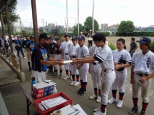 7月22日(土)、第75回小金井市民体育祭軟式野球大会に小金井野球クラブBチームとの合同チームで参加しました。1回戦は、中大付属中が棄権したため不戦勝。準決勝戦は小金井二中と対戦し、接戦に持ち込むも0対2で敗退。敗れたものの先発した芝﨑君は、選手権大会で第10ブロックベスト4に残った小金井二中打線を相手に6回を投げて自責点1の好投を見せました。結果は3位となり、銅メダルを獲得しました。