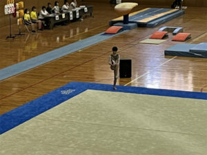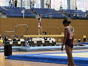第54回関東中学校体操競技大会に出場した1年大久保さんは、8月10日の3班12組で14:55から、試合がはじまりました。大久保さんの組は、埼玉県、千葉県、茨城県のそれぞれ個人で勝ち上がってきた選手たちと一緒の組で、各種目を回って演技をしました。