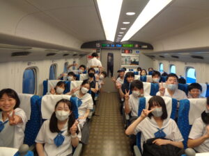京都駅につく前に、新幹線車内で少し早めの昼食をとり、その後バスで法隆寺に向かいます。生徒たちは今日から始まる古都での見学や体験をとても楽しみにしている様子です。