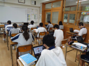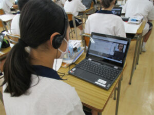 本校の英語教育は「使える英語」を目指して、日々の授業に取り組んでいます。2学期より1年生のオンライン英会話がスタートしました。オンライン英会話は、週に1回Chromebookを使って海外の外国人講師とマンツーマンのレッスンを行い、英語を積極的にアウトプットすることを目的に行っています。初回ということで初めは緊張している様子でしたが、25分間自分の今の英語力を発揮し、濃い時間を過ごせたようで終了時には達成感を感じている様子でした。週に1回のオンライン英会話の授業が更に活きるように、日頃の授業内でも音読活動や表現活動を重視していきます。