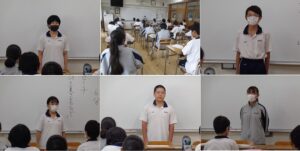 「ひと夏のおもひで」というテーマでスピーチを行っています。授業で取り組む初めてのスピーチですので、話しやすいテーマとはいえ、しっかりと原稿を書き、原稿を見ないで言えるように練習をして本番を迎えました。単なる夏休みの報告ではなく、各自が体験したことを具体的に語るとともに、そこから得た感動や自分の感想・意見を必ず入れるようにしていますので、それぞれ聞きごたえのあるスピーチに仕上がっています。今後は国語の授業だけでなく、HRや生命科、各授業内でもこういう機会を設け、スピーチ力、自己表現力の向上を図っていきます。